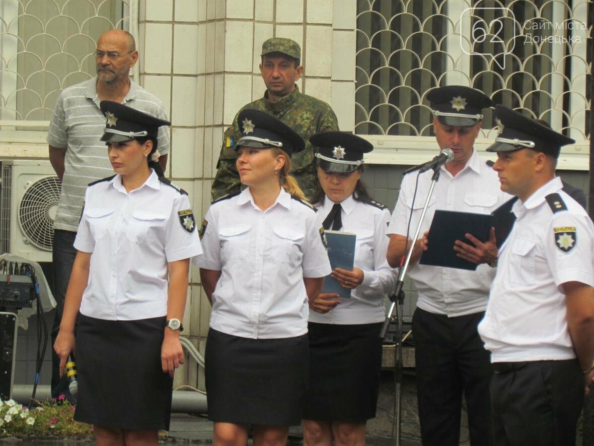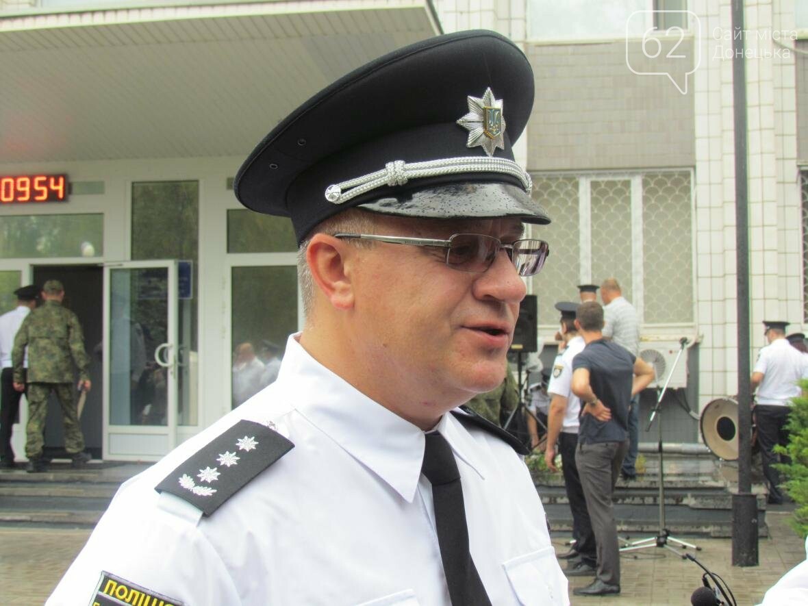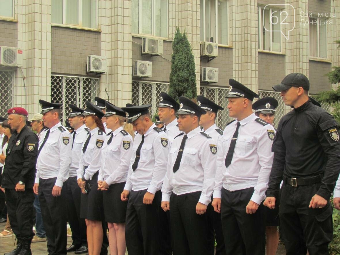 Празднование началось с построения личного состава полицейских Донецкой области и приданных сил. В небо под звуки Гимна взмыл государственный сине-желтый флаг. Обращаясь к полицейским, начальник полиции Донецкой области Виталий Невгад отметил, что независимость Украины является результатом борьбы целых поколений патриотов. Основной целью полиции он обозначил сохранность свободы, целостность страны и защита ее граждан. Также Невгад отметил возрастающий уровень доверия граждан к правоохранителям.