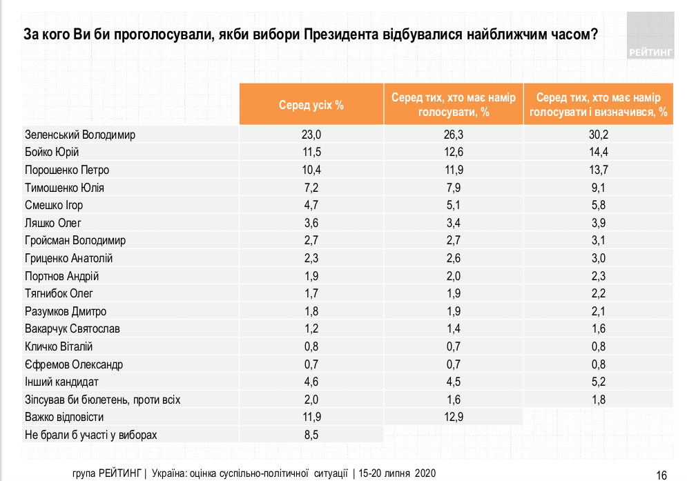 "Еще 5,8% проголосовали бы за И.Смешко, 3,9% - за О. Ляшко, 3,1% - В.Гройсмана, 3,0% - Гриценко. Рейтинг других кандидатов не более 3%, еще около 13% не определились", - говорится в опросе.