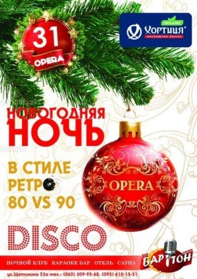 31 декабря клуб Opera приглашает Вас на празднование нового 2013-го года "Ночь в стиле Retro 80х-90х годов"!!! Вас ждет незабываемая новогодняя атмосфера того времени, поздравление президентов, интерактивные конкурсы и еще множество сюрпризов. Ведущий вечера Rest-men, резиденты вечера один из лучших шоу-балетов в Украине шоу - балет Happy. Ритмы мелодий 80х и 90х не оставят вас равнодушными, до самого утра.