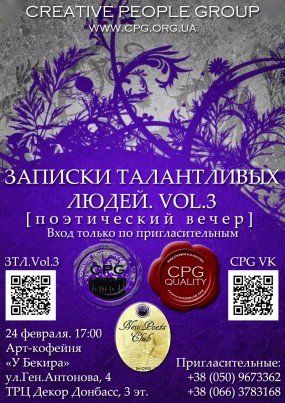 CPG проект "Клуб Новых Поэтов" представляет третью часть поэтических записок, вход на которую - традиционно по Вашим заранее заказанным пригласительным.