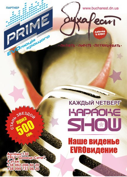 Лучшая музыка и Ваши любимые песни в собственном исполнении! Уверены в своем голосе? Придите и докажите превосходство своих вокальных данных! Приз - 500 грн. В конце каждого месяца финал, где примут участия 4 еженедельных победителя и 1 за кого больше всего проголосуют в группе! Приз: личная звезда на нашей " аллее звезд", запись на студии и безлимитное исполнение в караоке-буфете "Бухарест"! Приходи, будет очень интересно!