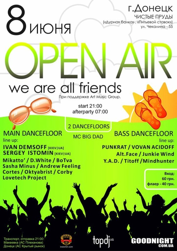 И вот наконец настало время нам открывать сезон вечеринок под открытым небом. В этот раз мероприятие пройдёт в живописном уголке Донецка "Питьевой ставок" - "Чистые пруды". По многочисленным просьбам о расширении репертуара было принято решение сделать два танцпола "Main Dancefloor", находившемся на первом этаже летнего открытого заведения и "Bass Dancefloor", находившемся на пляже рядом с заведением, а также гости с Киева: Ivan Demsoff and Sergey Istomin. Для вашего удобства на территории размещены два бара. На втором этаже заведения уютные места также с видом на водоём.Вас ожидает: уютная атмосфера, бесконечный музыкальный драйв, доступные цены, свежий шашлык.