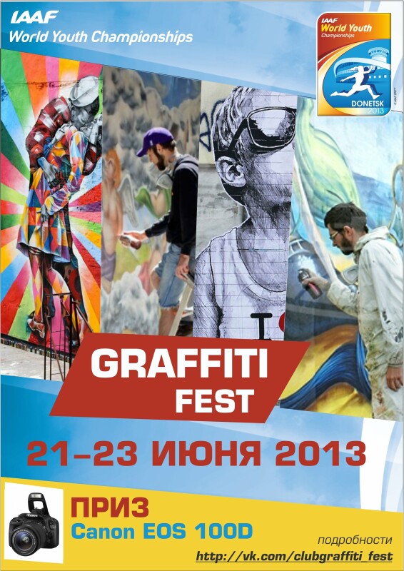 Художники города Донецка будут соревноваться в искусстве граффити за главный приз – фотоаппарат CanonEOS 100D. Еще одно мероприятие в рамках подготовки к Юношескому Чемпионату ИААФ по легкой атлетике даст возможность заявить о себе творческому потенциалу Донбасса.