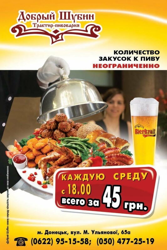 По средам в зале Пивоварни. Оплачивается вход 45 гривен и в течение 3-х часов официант приносит закуски к пиву(холодные и горячие) в том количестве, сколько душа пожелает! Выгодно и вкусно!