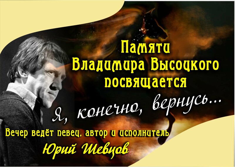 Традиционный вечер памяти Владимира Высоцкого в Донецком Клубе шансона "Музыка любви". Автор и ведущий известный бард и шансонье Юрий Шевцов с программой "Я, конечно, вернусь...", в которую вошли песни и стихи Владимира Высоцкого, а так же воспоминания друзей и современников великого барда. В вечер принимают участие так же донецкие авторы- исполнители и исполнители.