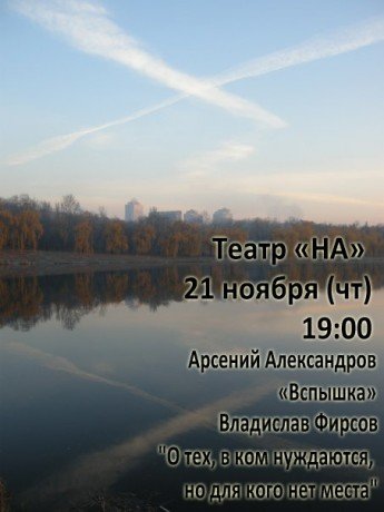 Вас ожидает читка современной пьесы о Донецке Арсения Александрова "Вспышка", а также произведение Владислава Фирсова "О тех, в ком нуждаются, но для кого нет места".