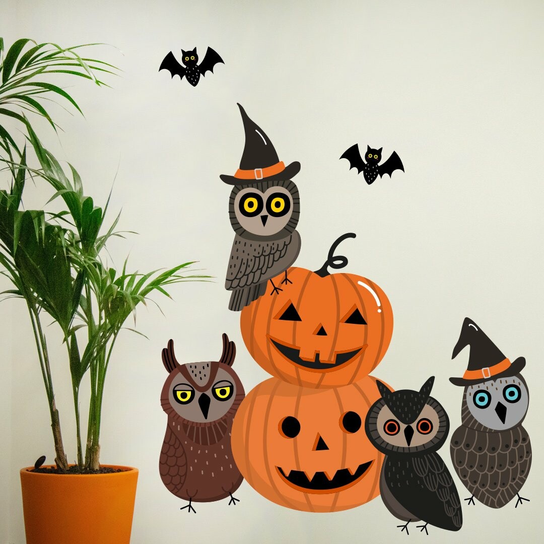 Класичний символ свята — різьблені гарбузи з різними виразами обличчя. Можна прикрасити вікна, двері або меблі, створивши відчуття справжньої хеловінської атмосфери. Милий або моторошний привид, кажани, летючі миші, сови — додають кімнаті містичності. Наклейки з образами чарівників, метеликами, магічними символами та мітлами створюють атмосферу казковості та пригод, особливо підходять для дитячих кімнат. Можна додати наклейки з масками, капелюхами, котелками та павутинням. Вони чудово підходять для декору кімнати перед вечіркою або фотозоною. Черепи, скелети, чорні кішки, летючі сови і місячне сяйво потрібні для створення більш драматичного ефекту.