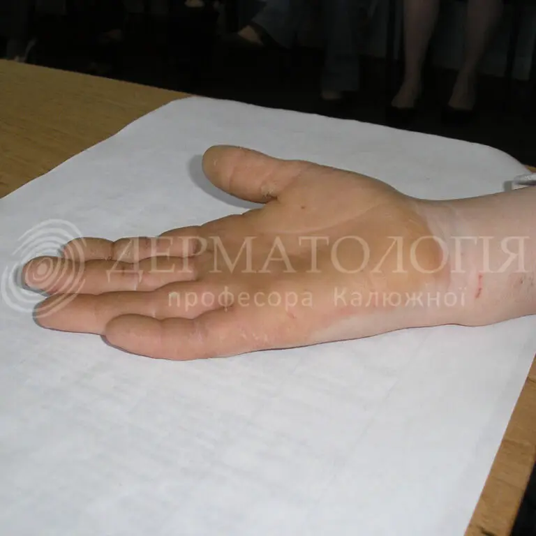 - Потовщення шкіри на долонях і стопах — вона стає твердою, сухою і шорсткою.