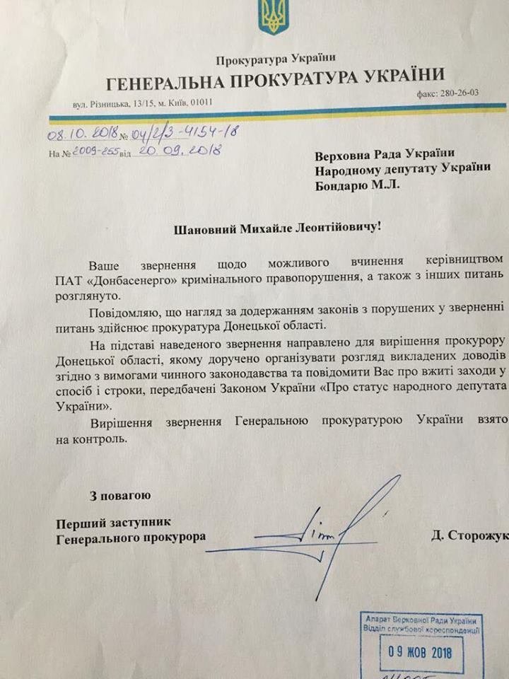 «Обращение направлено для решения прокурору Донецкой области, которому поручено организовать рассмотрение изложенных доводов в соответствии с требованиями действующего законодательства и сообщить вам о принятых мерах», - написал Сторожук.