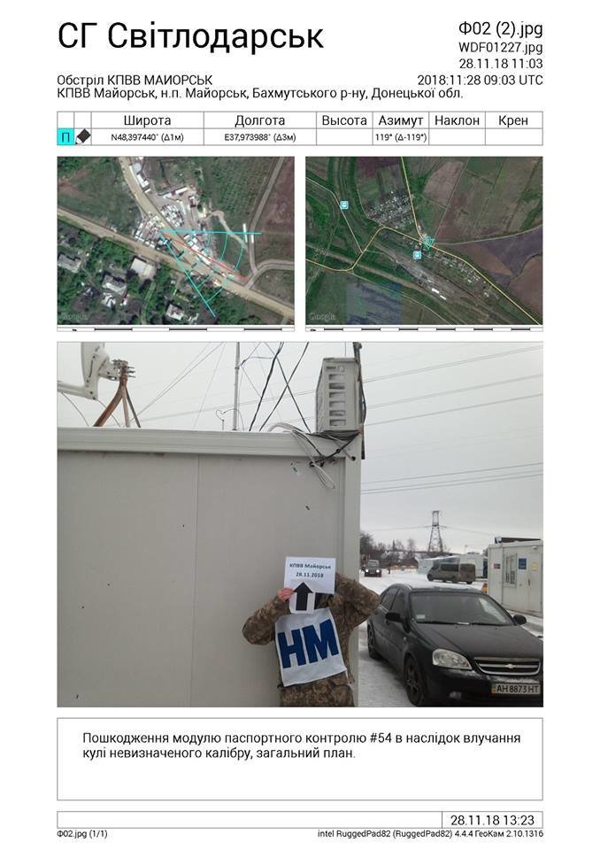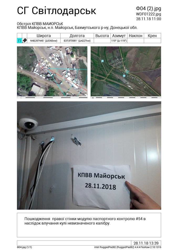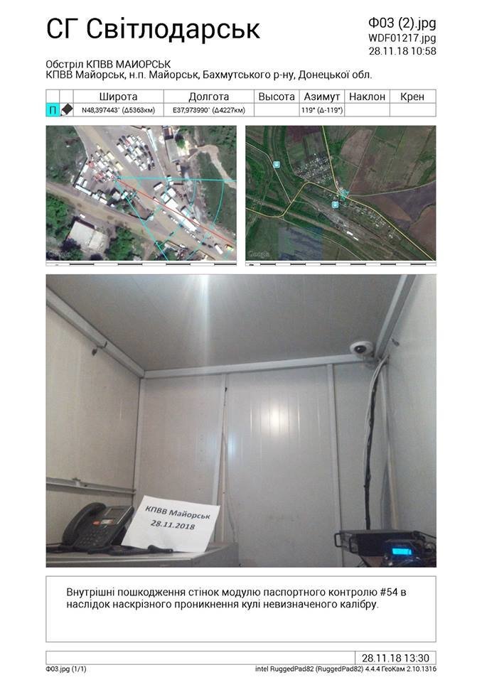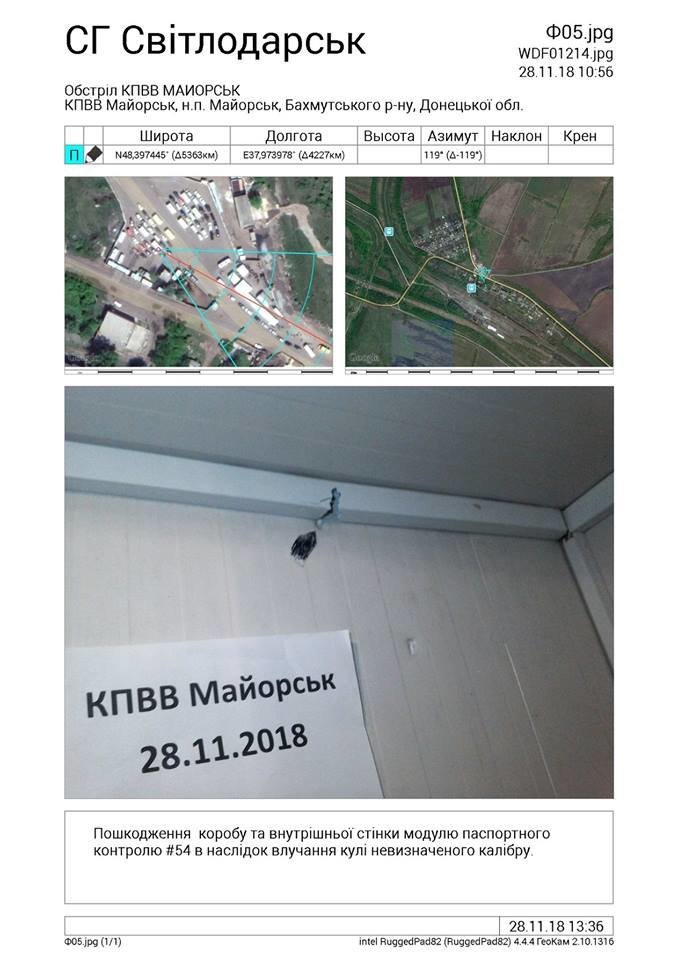 На следующий день, перед началом работы КПВВ «Майорск» пограничники обнаружили сквозное отверстие в правой наружной стенке и частичное повреждение внутренней перегородки модуля паспортного контроля №54 КПВВ от попадания пули неопределенного калибра. Пробив внешнюю стенку, пуля застряла во внутренней перегородке модуля.