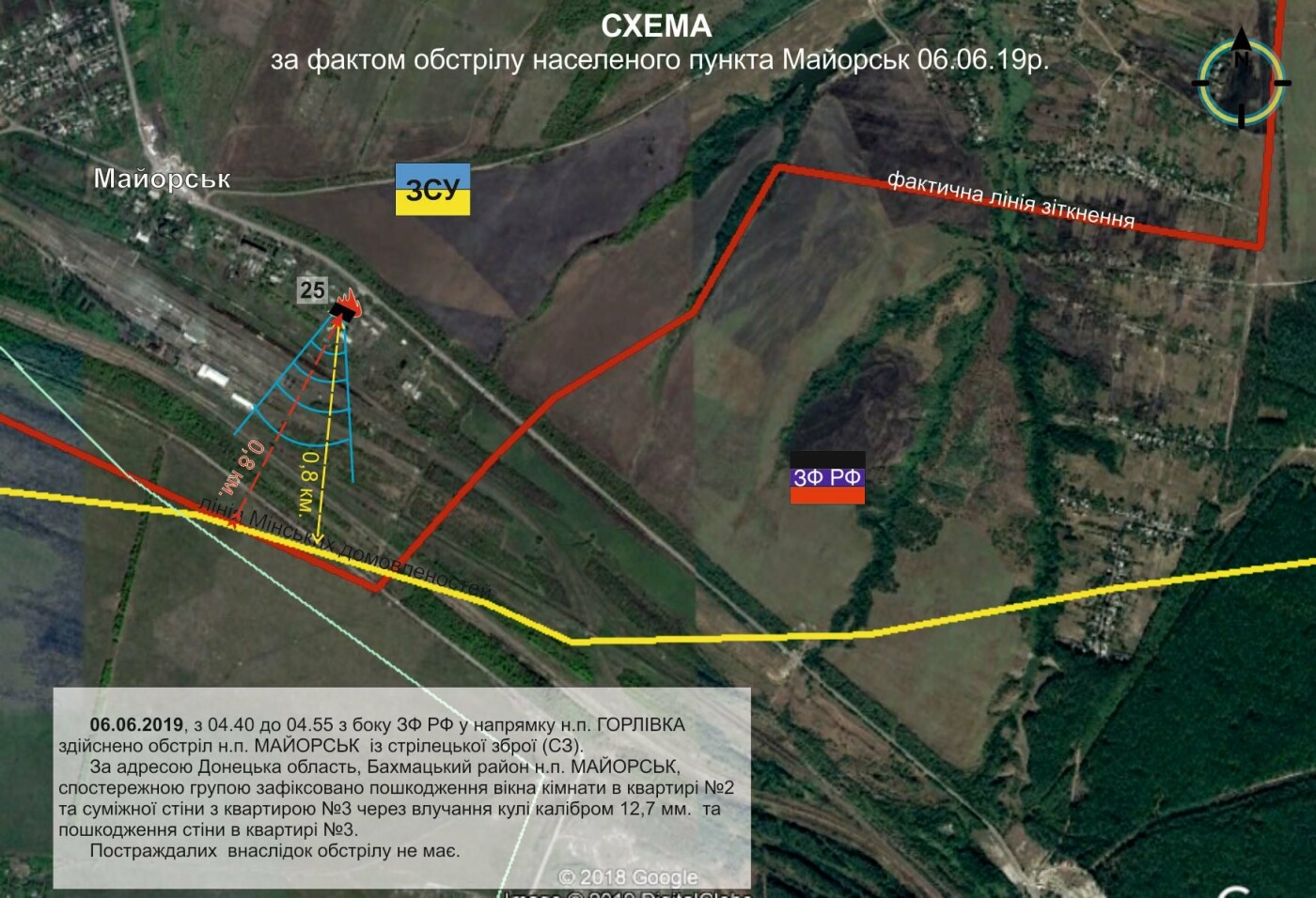 6 июня в 5 утра, вооруженные формирования РФ со стороны оккупированной Горловки совершили обстрел н.п. Майорск из стрелкового оружия. Прибыв на место, наблюдательным группой "Светлодарск" зафиксированы в двух соседних квартирах, повреждения окна комнаты, смежной и внешней стены, из-за попадания пули калибра 12,7 мм.