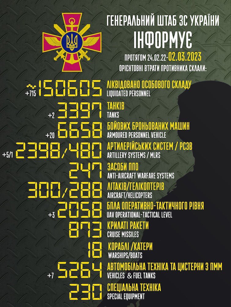 Загальні бойові втрати Росії з 24.02.22 по 02.03.23 орієнтовно склали 150 605 осіб. За минулу добу сили оборони України ліквідували 715 окупантів.