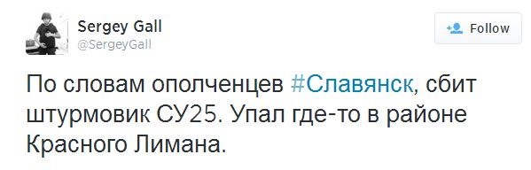 «По словам ополченцев Славянска, сбит штурмовик СУ25. Упал где-то в районе Красного Лимана» — сообщил еще один пользователь.