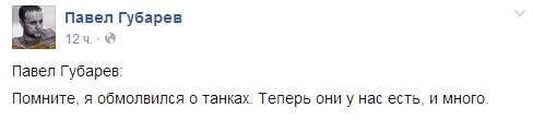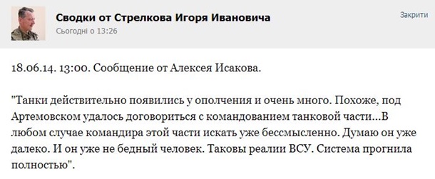 О наличии у ополченцев танков также заявил "министр обороны" ДНР Игорь Стрелков. На странице ВКонтакте он поделился сообщением некоего Алексея Исакова, в котором говорится, что "танки действительно появились у ополчения, и очень много."