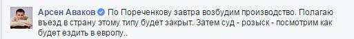 "По Пореченкову завтра возбудим производство. Полагаю въезд в страну этому типу будет закрыт. Затем суд – розыск – посмотрим, как будет ездить в Европу", – написал министр.