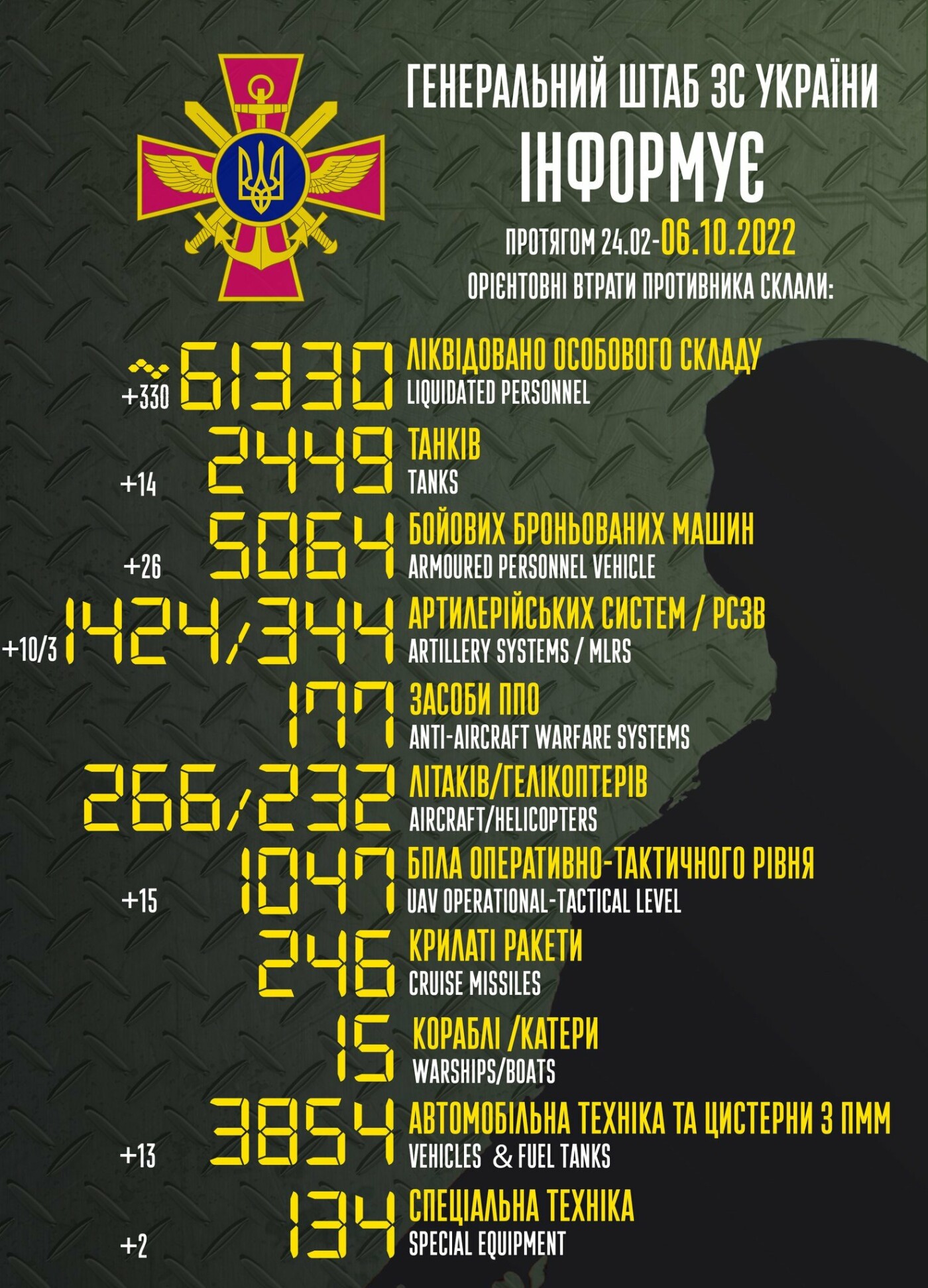Общие боевые потери противника с 24.02 до 06.10 ориентировочно составили: